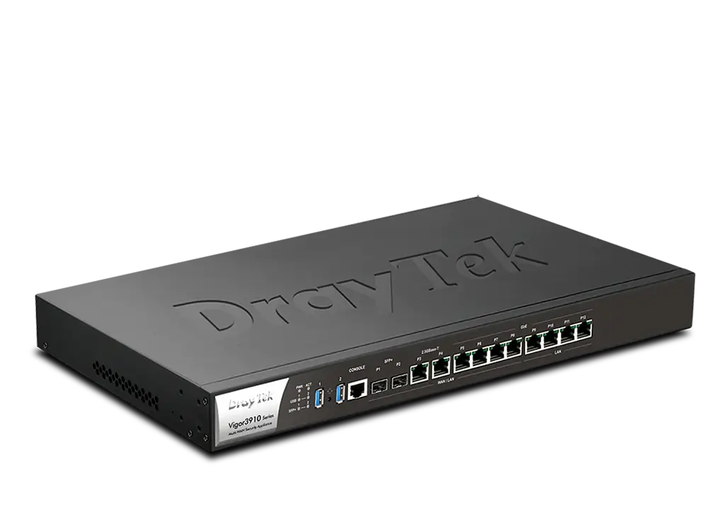 The Vigor3910 Multi-WAN router is a high-performance enterprise level broadband router with 2 x 10Gb SFP+ Fibre configurable WAN/LAN slots, 2 x 2.5GbE configurable WAN/LAN ports, 4 x 1GbE configurable WAN/LAN ports, and 4 x fixed GbE LAN ports.