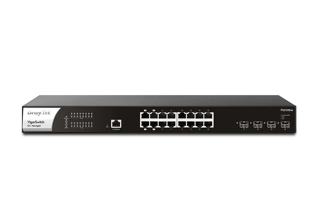 DrayTek VigorSwitch PQ2200xb features 16 x 2.5GbE ports for LAN and 4 x 10G SFP+ for uplink/downlink. It has 4 x PoE++ ports providing up to 90W per port and 12 x PoE+ ports. With a total of 400W output, it is ideal for business applications with IoT devices, such as LED lighting, POS (point of sale) computer, sensors, IP cameras, etc.